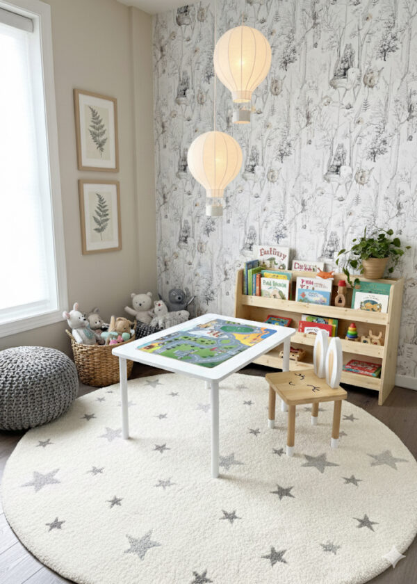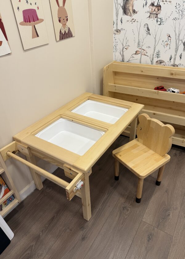 Kağıt rulolu Montessori aktivite masası ve ayı kulaklı ahşap sandalye seti, 80x60 cm ladin ahşap tasarım.