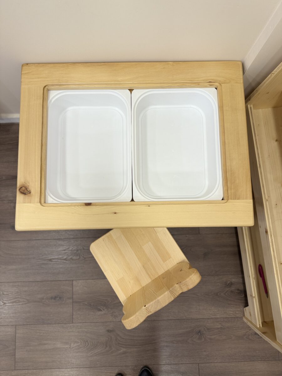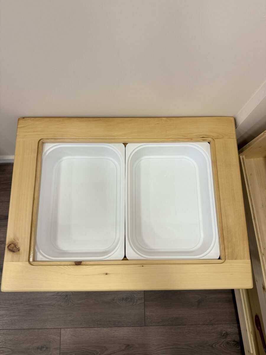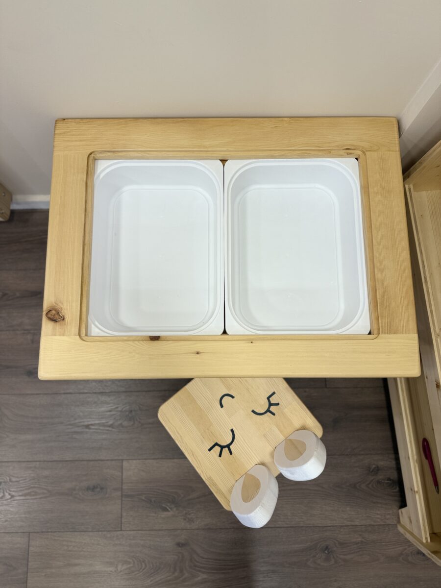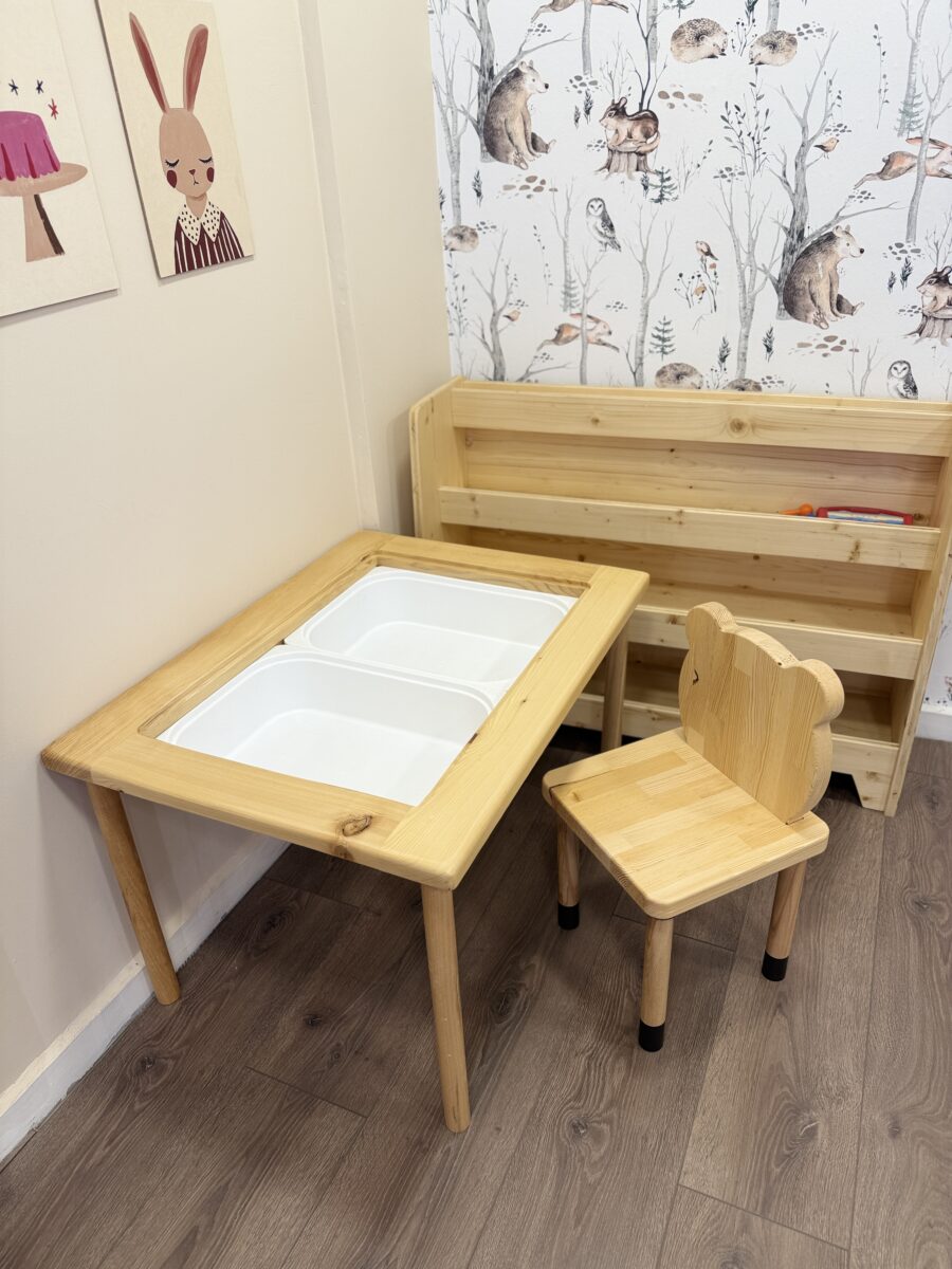 Doğal ahşaptan üretilmiş Montessori uyumlu çocuk aktivite masası, 2–6 yaş arası çocuklar için özel olarak tasarlanmıştır.