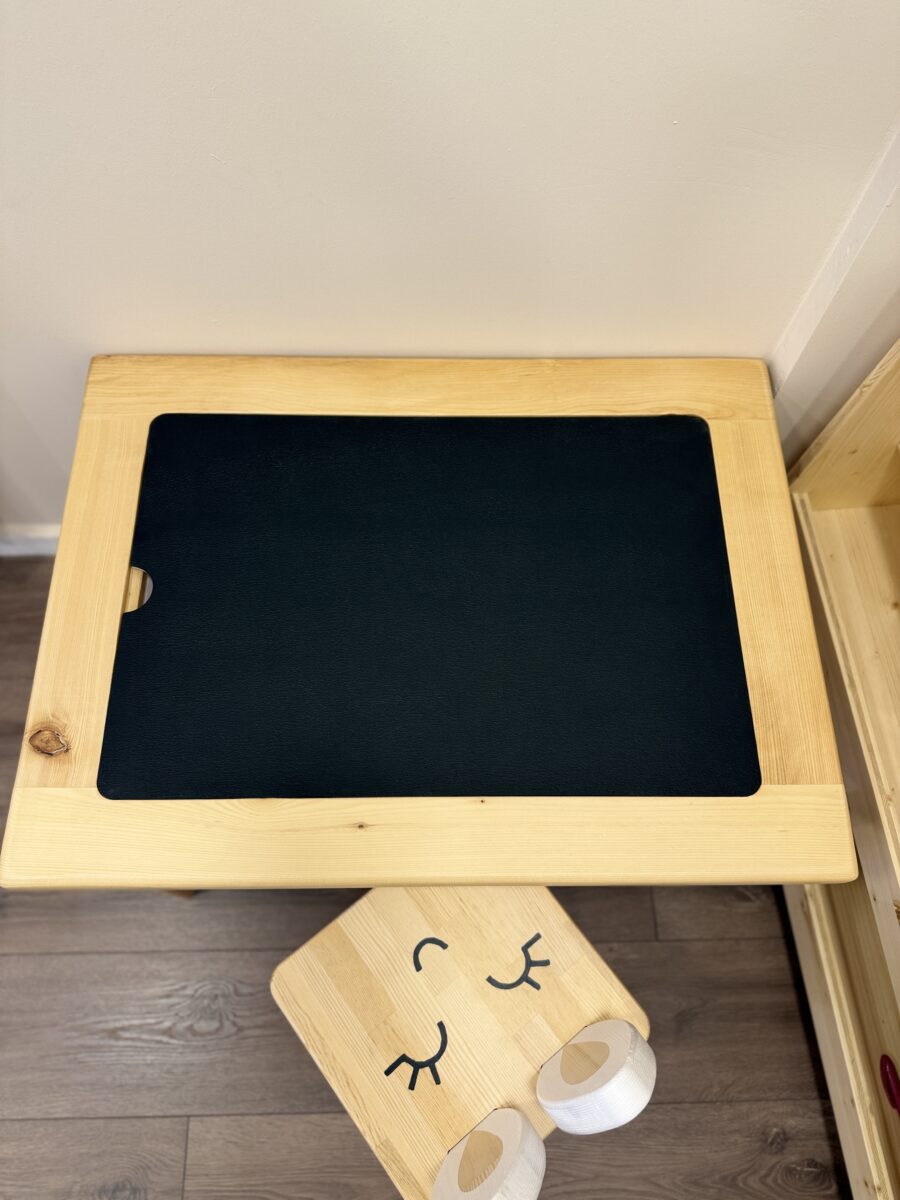 Masa kapağı çift yönlü olarak tasarlanmıştır. Bir yüzü kara tahta, diğer yüzü ise beyaz yazı tahtası işlevi görür. Böylece çocuklar hem tebeşir hem de beyaz tahta kalemiyle farklı teknikler deneyebilir.