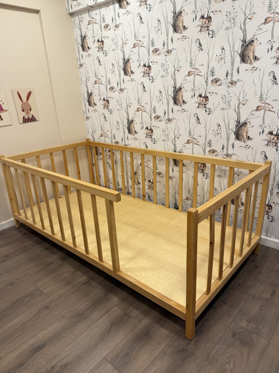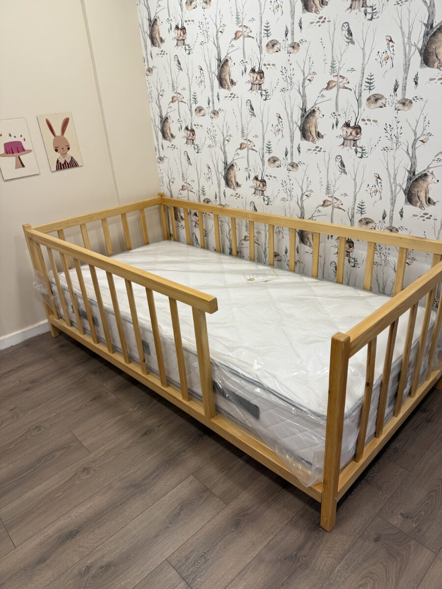 • Montessori felsefesine uygun olarak tasarlanan bu doğal çam ağacı yatak, yere yakın yapısı sayesinde çocuğunuzun yatağa kendi başına güvenle girip çıkmasını sağlar. Su bazlı vernikle korunan yapısı tamamen sağlıklı, doğal ve dayanıklıdır. Güvenli korkulukları ve estetik tasarımıyla çocuk odalarına hem konfor hem de özgürlük katar.